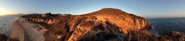 This panorama offers about a 180 degree view into two sections. On left side, you can see the sunset over the Pacific Ocean and Malibu Beach and in the other the Pirates Cove Beach.. a popular place for the movie industry to film.