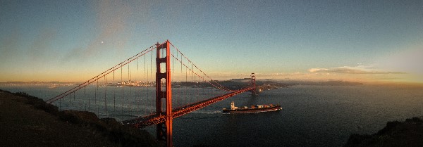 Delicate pink hues in the sky, container ship passing the Bridge, San Francisco in the background.